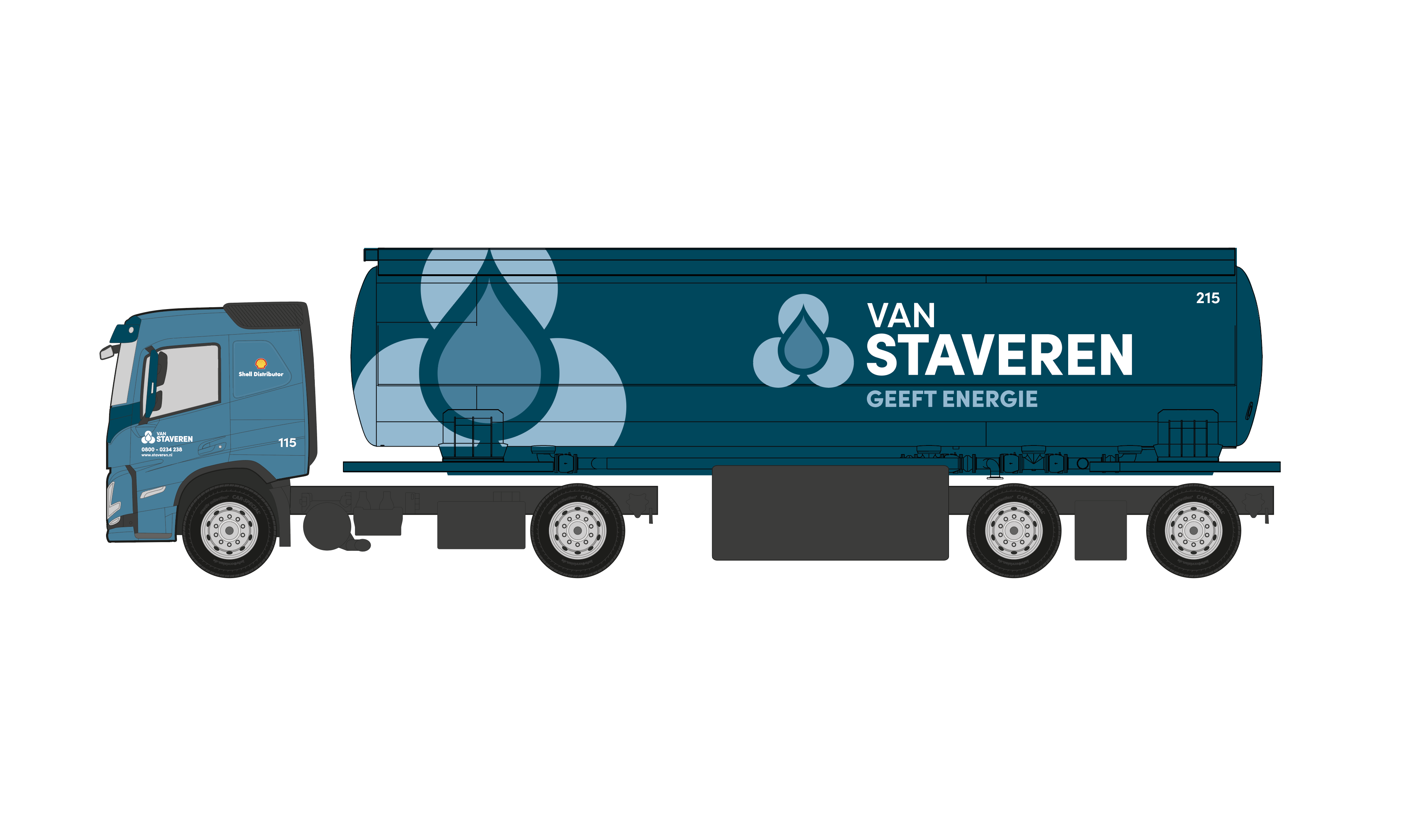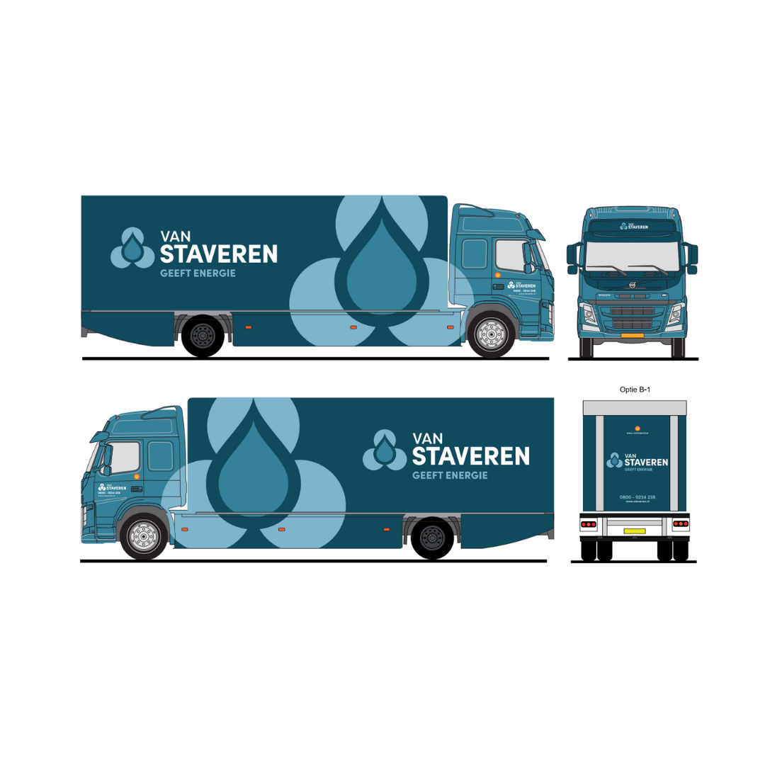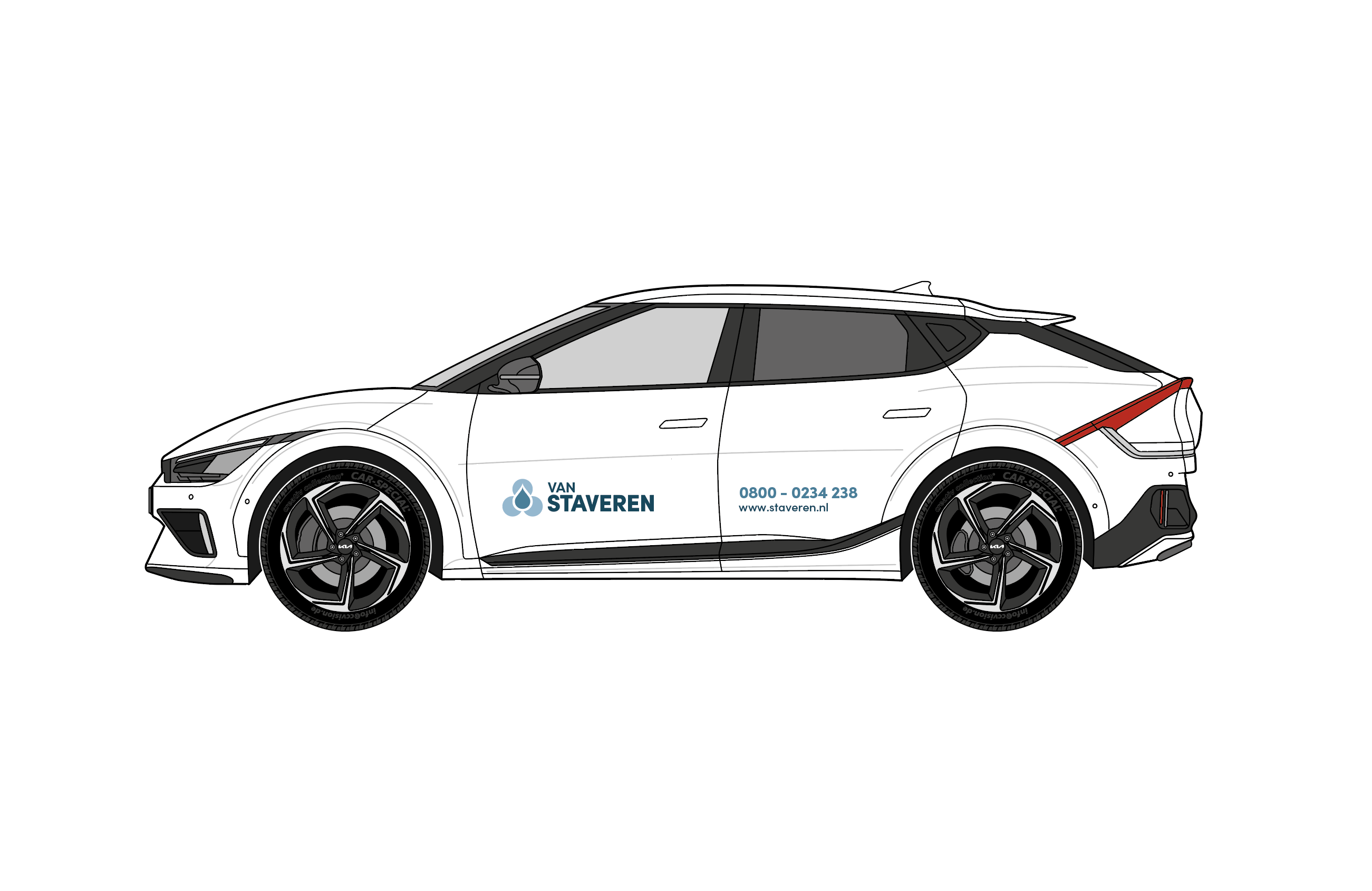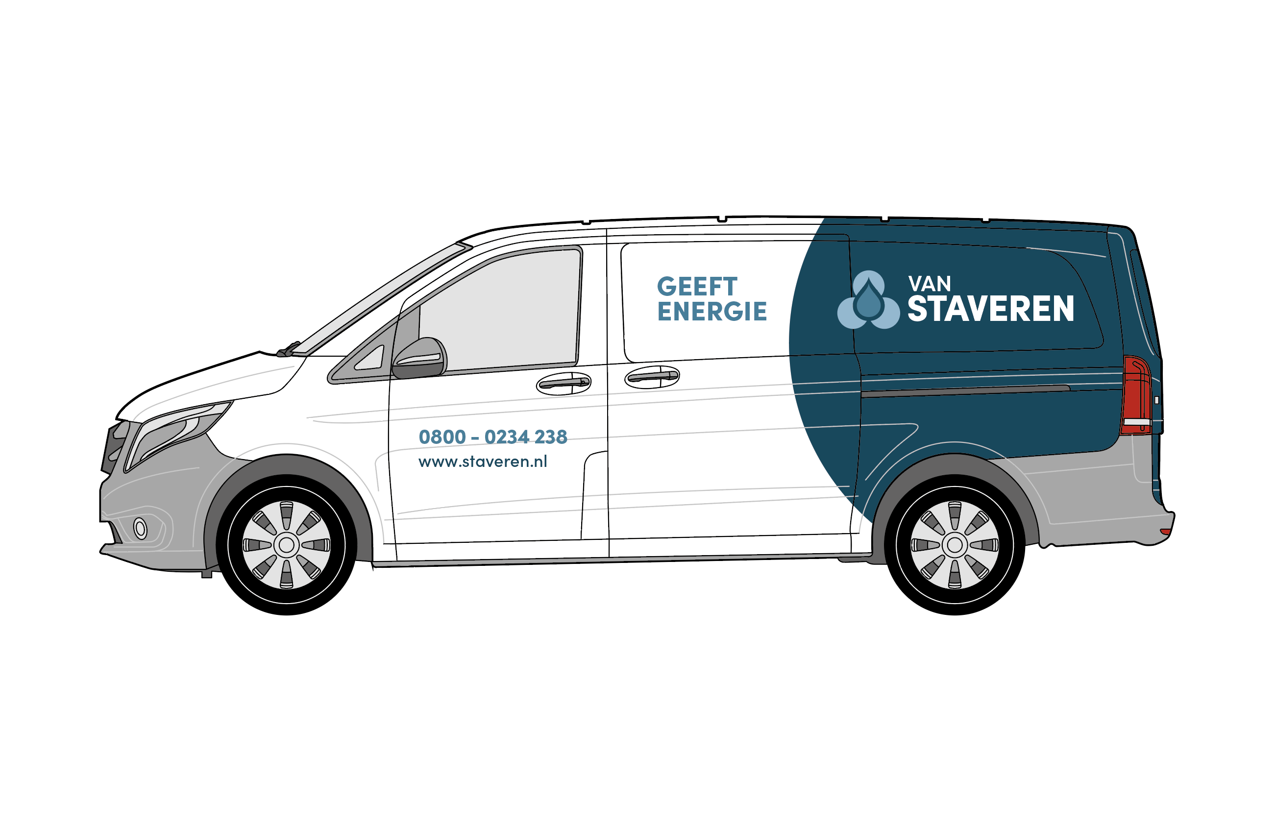 Op de van de bedrijfsauto’s wordt het logo van Van Staveren, het telefoonnummer en het webadres getoond. De stickers op de auto zijn zorgvuldig gesneden en geprint met de bestaande CMYK waarden om de huisstijlkleuren zo nauwkeurig mogelijk te benaderen.